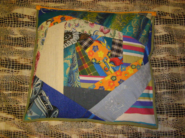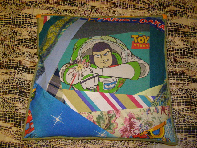 Дамы, класс! А я решила повторить идею FRAGONAR с подушечкой, но исполнение в стиле (и из остатков  ) развивающего коврика. В середине наш новый кумир - Базз Светик (была у среднего лет 7 назад такая футболка, Базза он выкинуть не дал  ). На обратной стороне хаос - все, что под руку попало  . Сверху молния потайная, внутри подушка-думочка (набитая шерстью). Вот: Присоединённые изображения
