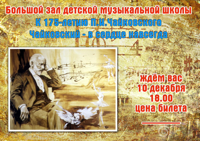 Добрый вечер Всем Мастерицам.  Опять приходится обращаться к Вам с просьбой.  В нашей школе будет проходить концерт,посвящённый П.И. Чайковскому.  Так как я организатор, то я должна сделать афишу и входные билеты. Рисовать афишу - уже прошлый век.  Может кто-нибудь сможет помочь? Размер афиши - А3. Сверху надпись - большой зал детской музыкальной школы. По середине - К 175-летию П.И.Чайковского, а затем название концерта: Чайковский - в сердце навсегда. Можно сбоку или с низу - 10 декабря, 18.00. И в самом низу - цена билета (цену впишу сама, пока не сказали). А на билете - просто Входной билет и сбоку линия отрыва и контроль. Если получится, то вставьте, пожалуйста фото Чайковского. Надеюсь, кто-нибудь сможет мне помочь.  Нашла вот такой фон,может пригодится...