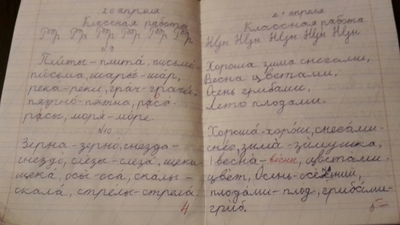 Добрый день! Что-то затянулось у нас с тестами... Напишу данные, которые удалось "добыть": 1) Ксюша, заканчивает 1 класс (в школу пошла в 7,5) 2) Скорость чтения 50-60 слов, с выражением. На длинных незнакомых словах иногда спотыкается, проскакивает интонационно знаки препинания. 3) Диктант отказалась писать, ни в какую... Письмо самое нелюбимое(( Прикреплю фото разворота тетради. 4) Бринги ввели в ступор. Брали 9 и 10й. Первые вопросы совсем не поняла. Остальные решила, но в разы дольше делала, чем указанные нормативы. 5) Скорость счета 3-4 мин. Проскакивают 1-2 ошибки по невнимательности (+ с минусом перепутала и наоборот). Еще некоторые цифры пишет до сих пор неправильно (5, 8, 9, 6). Подозреваю, что орфографическим режимом они в классе пренебрегают...