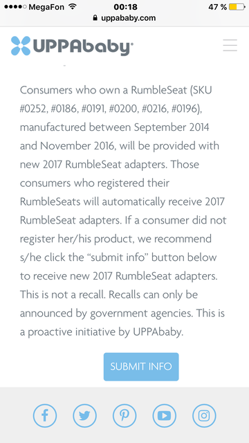 А теперь действительно в комплектации есть два дождевика: для люльки и для прогулки?) И адаптеры под maxi cosi? P.s. Возможно владельцам дополнительных кресел будет полезно: компания Uppababy меняет адаптеры к дополнительным креслам, выпущенным с сентября 2014 по ноябрь 2016, на новые из-за случаев с отстёгиванием. Отредактировано: afi в 6 окт 2017, 00:47
