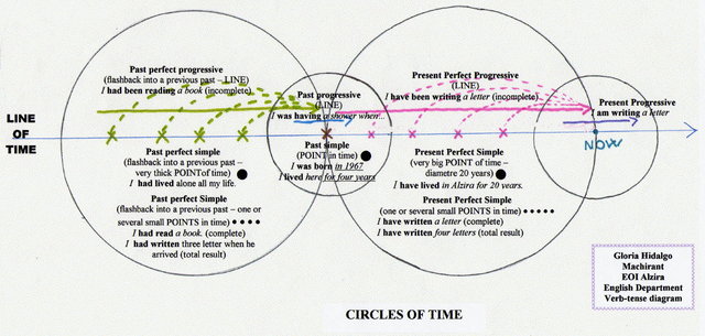 Много незнакомых слов может быть в тексте. Дети должны уметь понимать смысл, даже не понимая всех слов. Учат разным типам чтения. не люблю я эту методику. Знаю, понимаю, но не люблю  . Я по сто раз один текст не читаю, я его либо читаю, либо отбрасываю, а чтобы первый раз прочитать на "общее понимание", второй раз "на детали", а потом ещё слова выбрать, да не те, что не знаешь, а только те из тех, которые не знаешь, которые надо, мне занудно  . Ага,от учебника ребенок будет в восторге за 3 класс. По таблице ребенок видит структуру в целом и запомнит навсегда ,где стоит "s", а где "ed" и вторая форма ,а так люди годами учат и путают и путают годами,т.к.все учится по отдельности,пока одно учили,другое уже забыли,особенно на следующий год.В школе предлагают и неправильные глаголы учить по 2 формы,а 3 потом доучивать таблица - хорошо, но лучше на timeline каждое время показывать, рисунок прилагаю. Каждое время определяется от момента речи. Насколько я помню, Past только в 3 классе проходят, а Future вообще в 4. Зачем учить таблицу с употреблением тех времен, о которых еще нет представления? я поддержу.