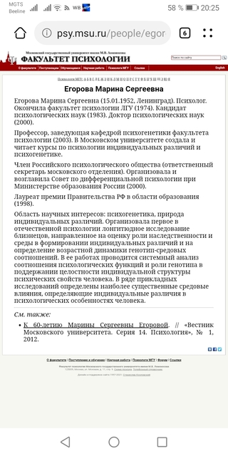 да..я поняла что Егорова психует это облатсь ее интересов ЦИТАТА Научные интересы Егоровой М. С. лежат в области психогенетики, дифференциальной психологии и психологии уникальности. Ею было организовано первое в отечественной психологии лонгитюдное исследование близнецов от 6 до 16 лет, в котором исследовались роль наследственности и среды в формировании индивидуальных различий и возрастная динамика генотип-средовых соотношений[1]. По итогам исследования была опубликована коллективная монография «Генотип. Среда. Развитие» под общей редакцией Егоровой М. С. (2004). В эмпирических исследованиях Егоровой М. С. освещается проблематика природы интеллекта, проблемы когнитивного и личностного развития близнецов, а также целый ряд других проблем психогенетики, в том числе такие новые для этой области вопросы, как роль генотипа и среды в формировании «тёмной триады личности», включающей такие индивидуально-психологические черты, как нарциссизм, макиавеллизм и психопатию[ здесь не близнецы, но сиблинги с минимальным разрывом по сути она прекрасно все понимает..что может быть и чего быть не может как явления это вот тоже ее работа ЦИТАТА «Общие закономерности психического развития человека на основных стадиях онтогенеза: социальная ситуация развития, роль семьи в развитии личности, роль генотипа в формировании индивидуальных различий» т.е. это не канцелярский работник из учебной части ЦИТАТА На факультете психологии МГУ М. С. Егорова разработала и читает курсы «Психогенетика», «Психология уникальности (теория и методы идиографического анализа)», «Основы дифференциальной психологии»[14]. Руководит научной работой студентов, аспирантов, специалистов, повышающих квалификацию. Под руководством М. С. Егоровой успешно защищено 8 кандидатских диссертаций[18]. а Тепляков не знает? она уже преподавала в тот период когда он там учился если учился