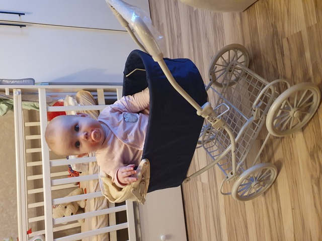 Не знаю, чего это она планирует, неужели встать? мы кстати вчера начали вставать в кроватке, Паша сначала на колени встаёт, потом подтягивается руучками за прутья кроваки, одну ногу выпрямлeт, потом другую Блиин, а какой он счастливый был когда встал, прям сам понял что совершил что-то крутое Больше него наверное только я радовалась)) Ольга_Калиноводка, какая у вас кукла клёвая в колясочке) Как раз по размерчикам))